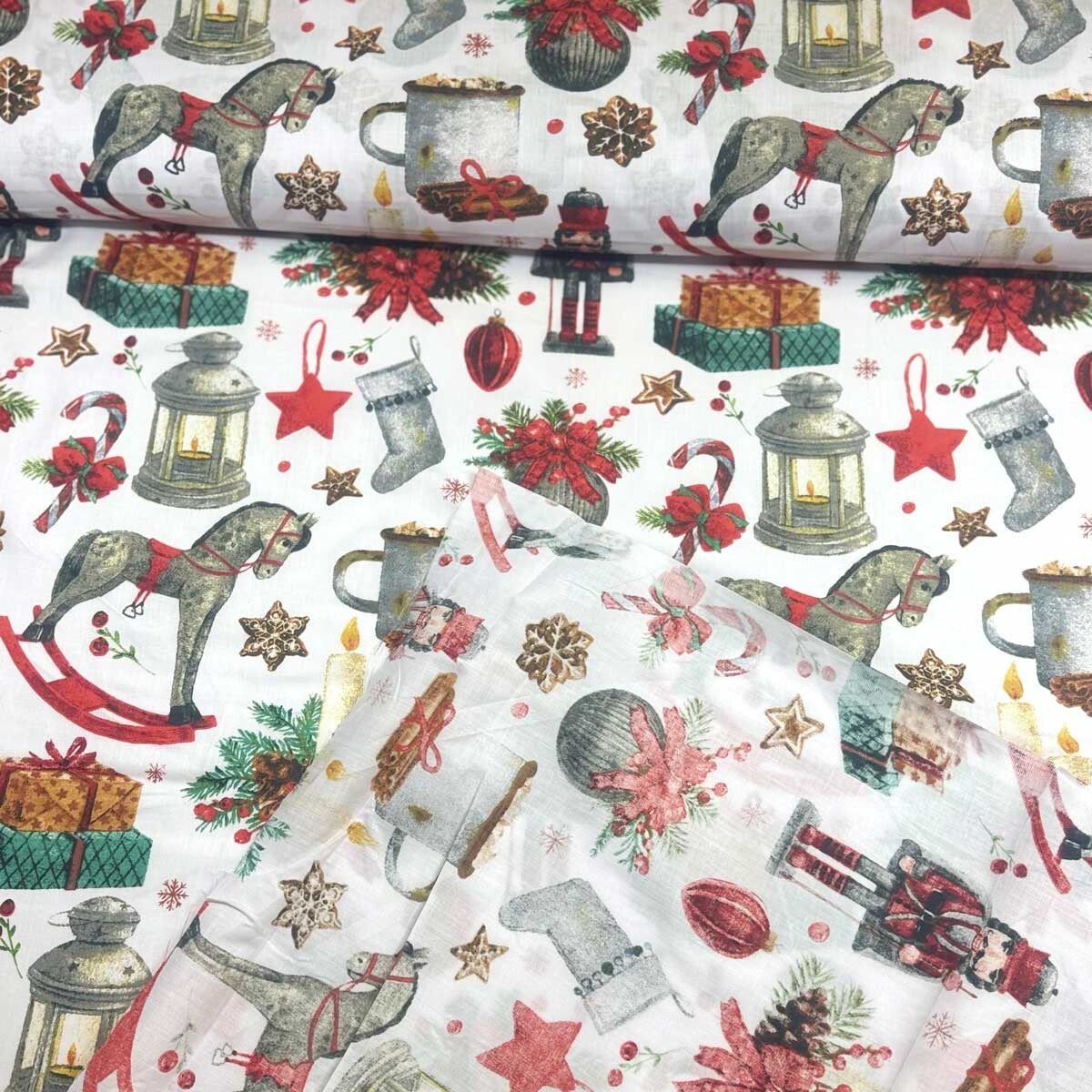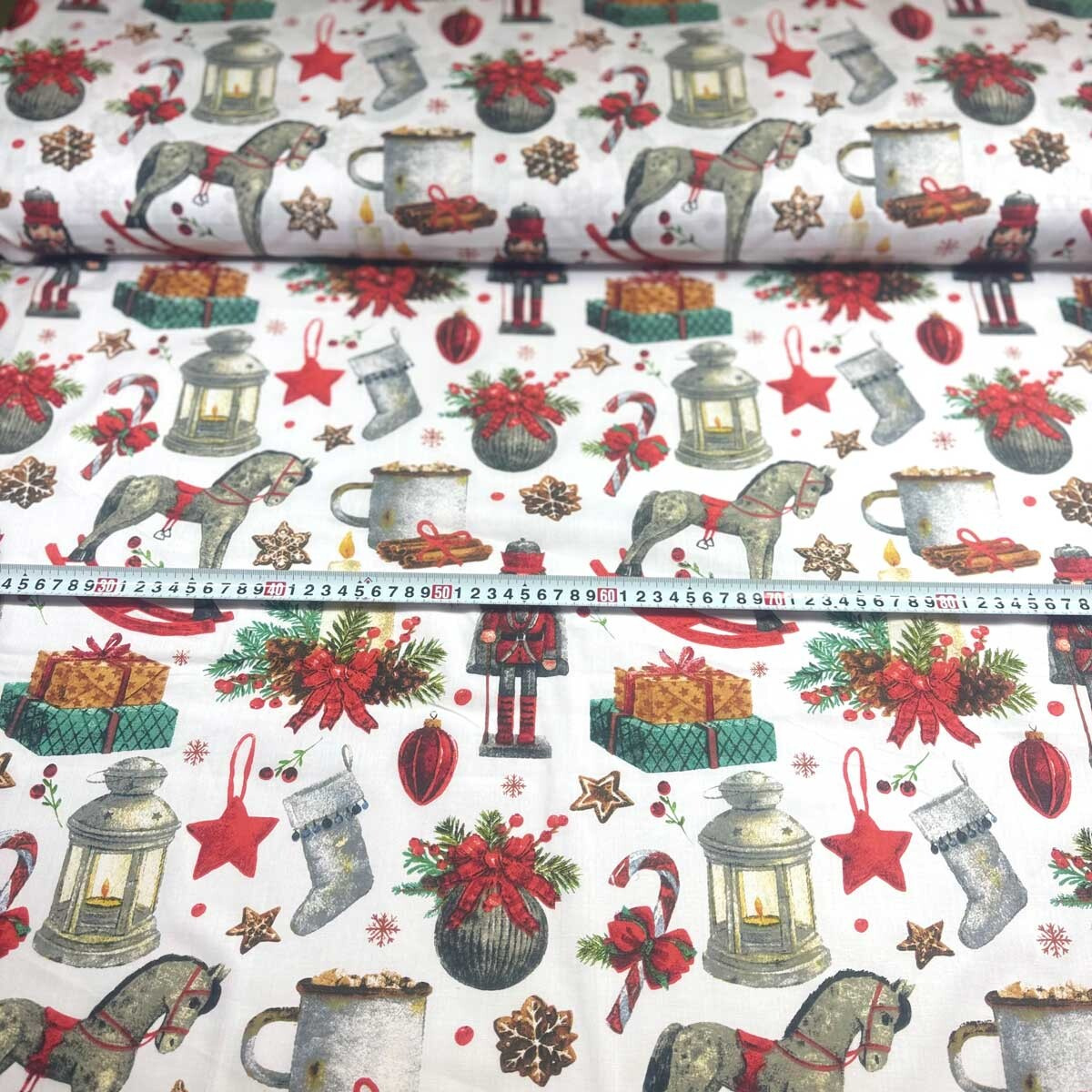 Christmas cotton fabric, by the meter, width 160 cm, Christmas motif on White