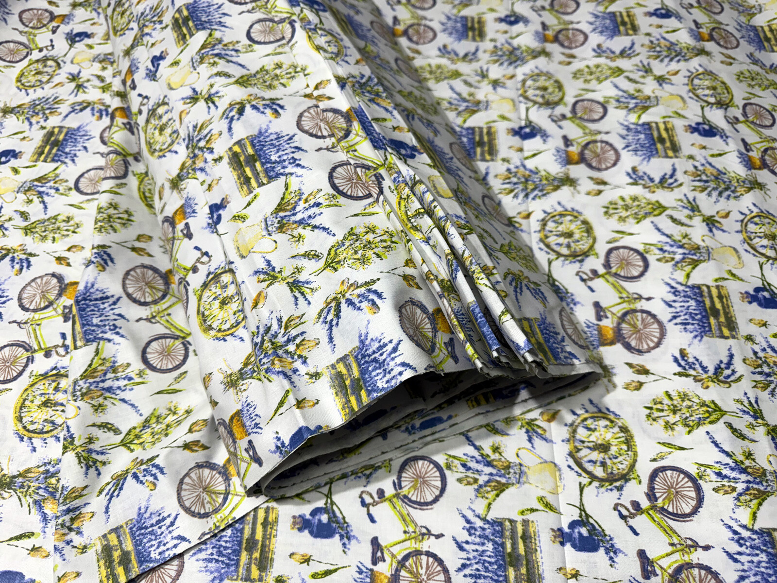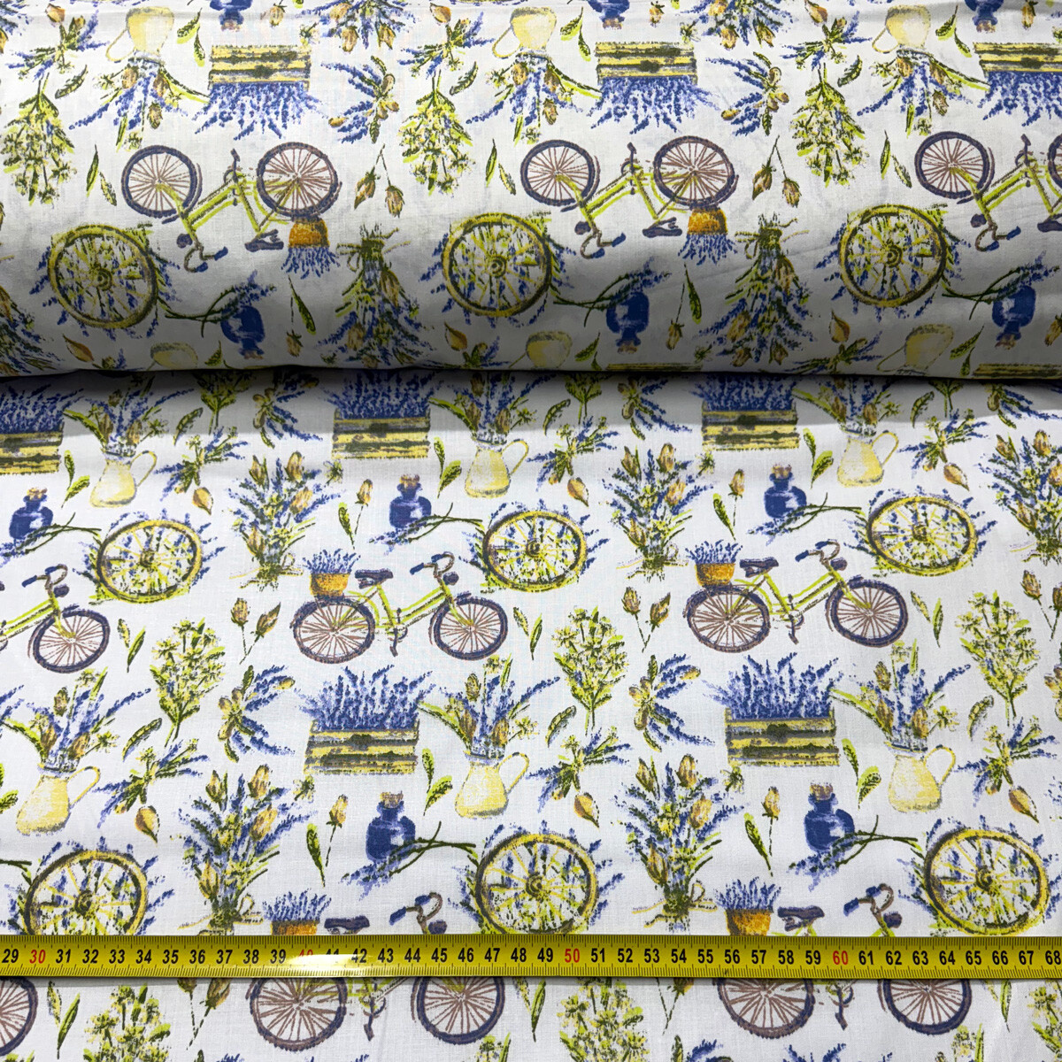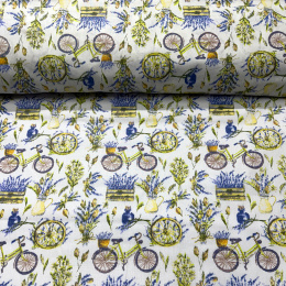 Description Cotton fabric 100% cotton, 125 g/m², width 160 cm, flowers and bicycle on white
