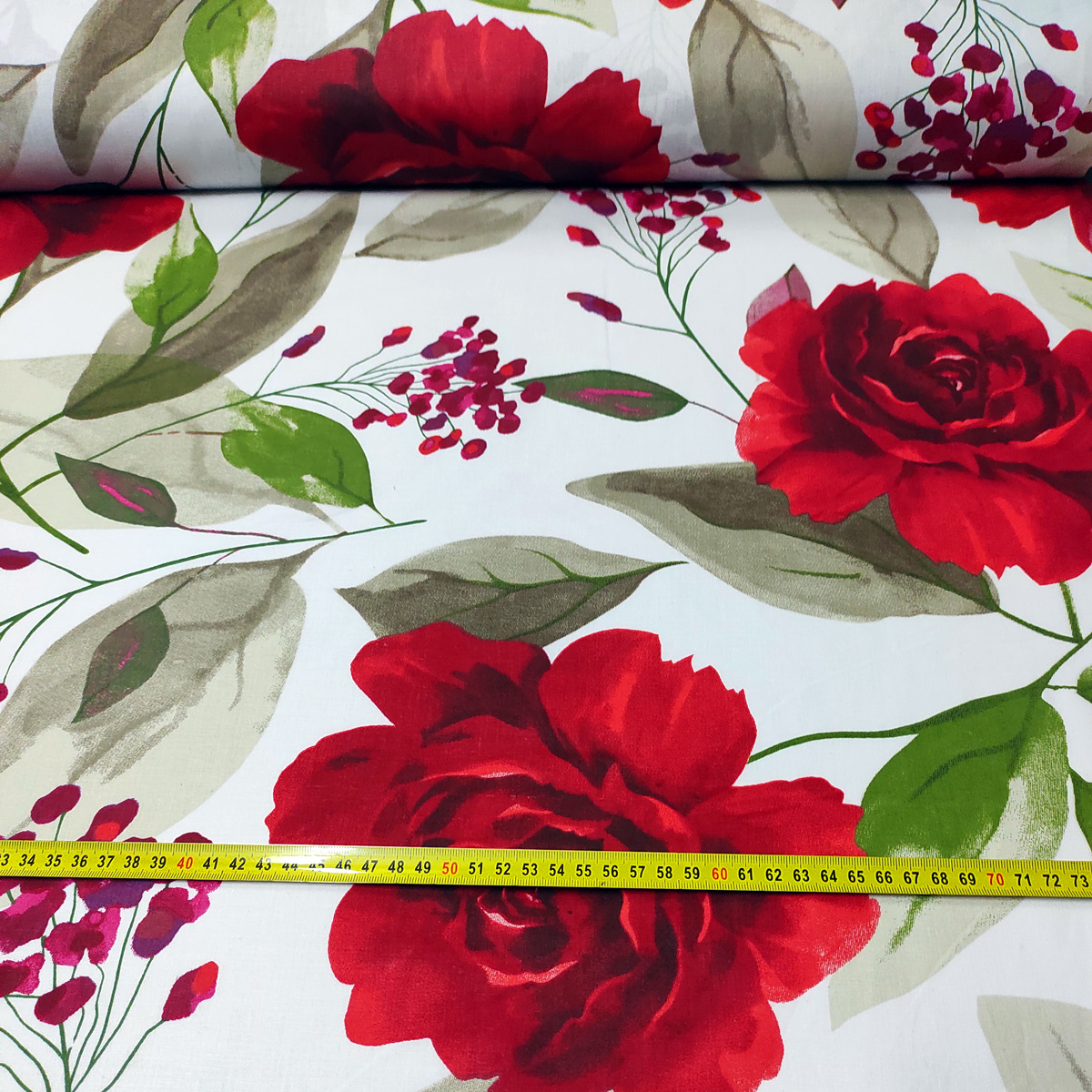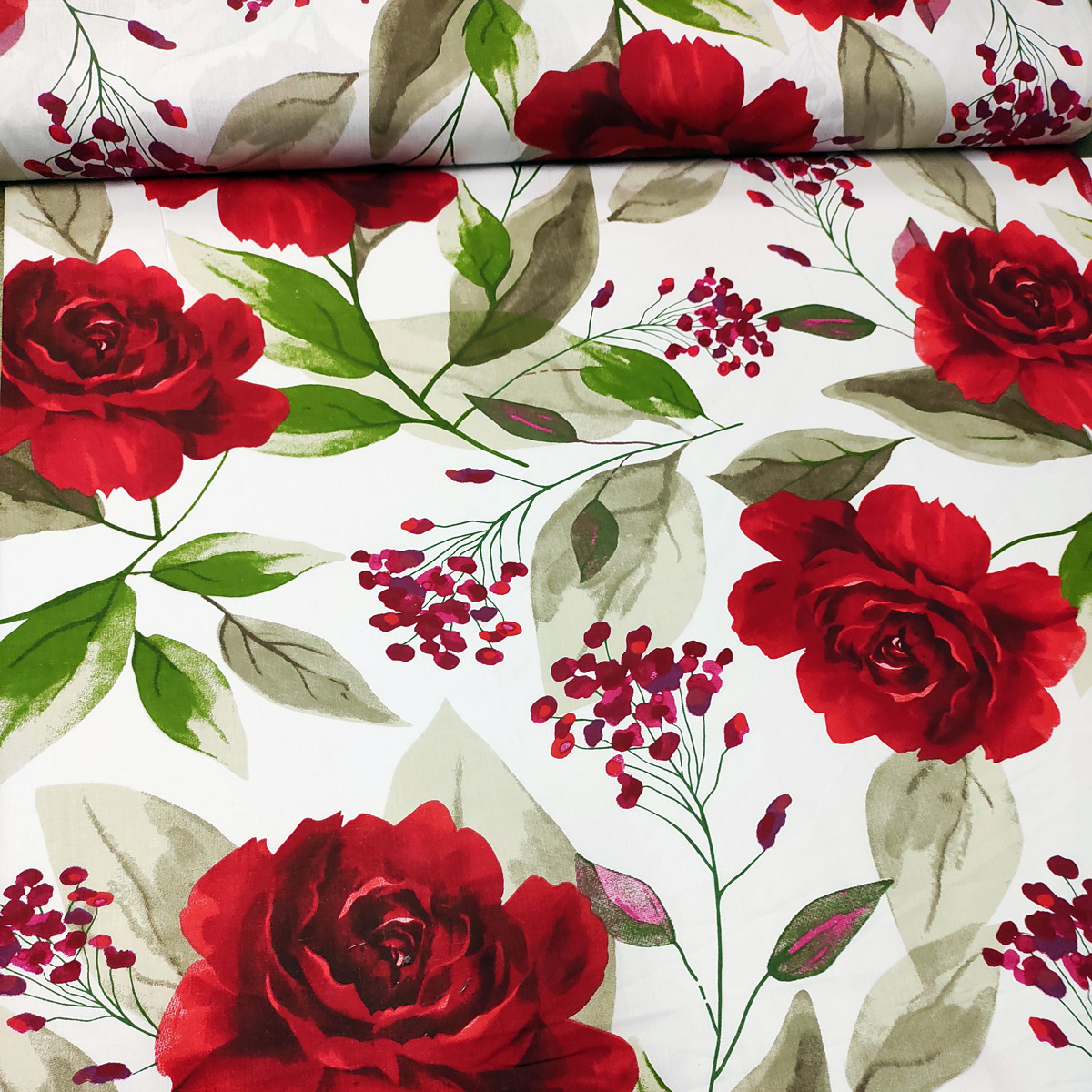 Description Cotton fabric 100% cotton, 125 g/m², width 160 cm, red flowers on white