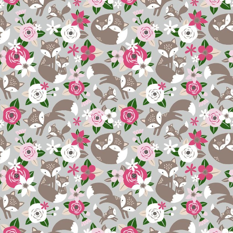 Description Cotton Fabric Pink Flowers and Foxes on Grey