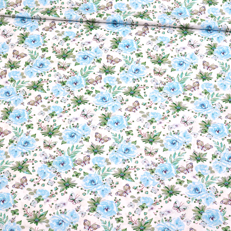 Description Cotton Fabric Small Flowers Blue Roses on White