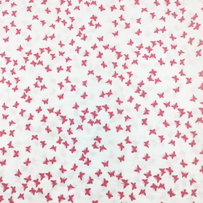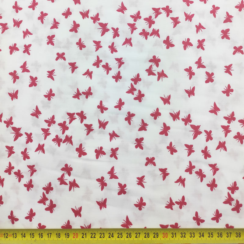 This PERCAL fabric features a delicate red butterfly motif on a soft, white cotton background, ideal for creating timeless pieces full of charm. Its smooth surface and lightweight feel make it an excellent choice for both casual wear and special occasions.