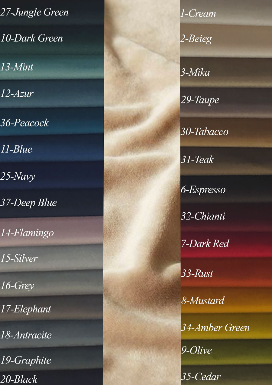 Velluto is a high-quality velour upholstery fabric with a fine, velvety soft texture that brings a sense of warmth, comfort, and elegance to the interior. Thanks to its natural appearance and pleasant touch, it is perfect for upholstering sofas, armchairs, ottomans, and other pieces of furniture. It combines timeless design with high functionality, making it an ideal choice for both modern and classic interiors.